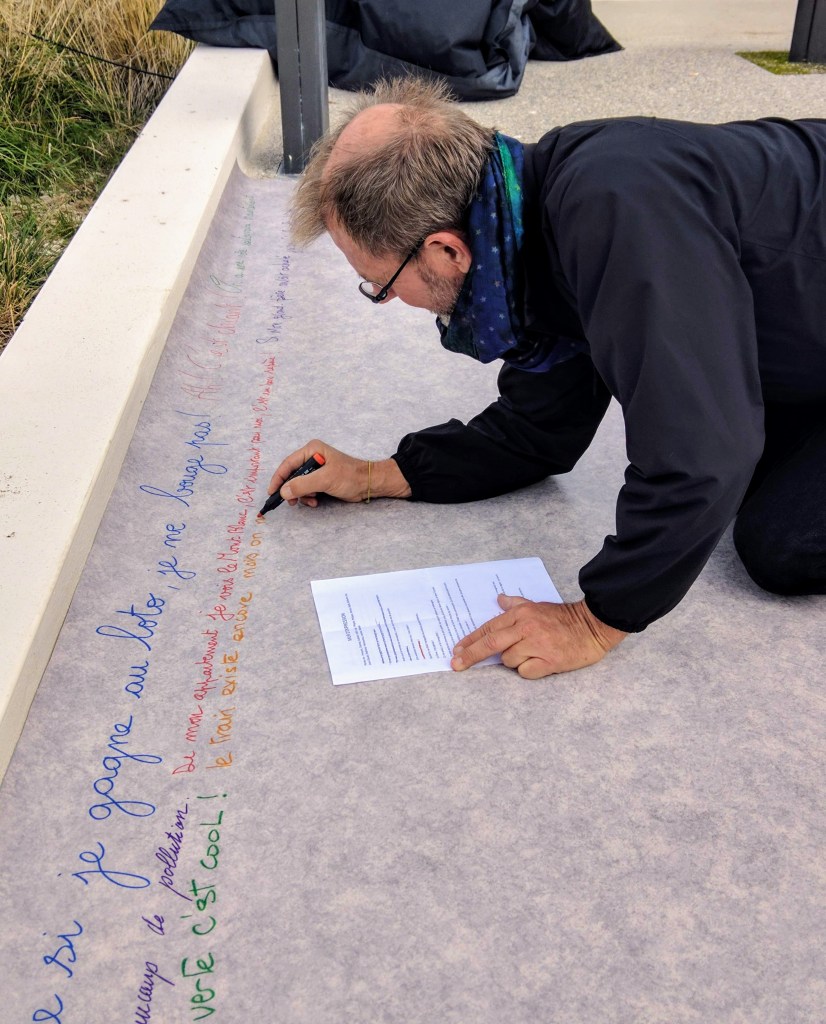 L’artiste-performeur met pour cela des matériaux (markers, phrases issues des interviews) et des consignes à disposition des passants, les laissant compléter l’œuvre collective. Les spectateurs jouent le jeu, certains prennent le temps de lire les propositions composant l’œuvre collective, d’autres sont immédiatement très inspirés, d’autres préfèreront recopier des phrases issues des interviews. Les mots deviennent les outils des passants qui vont produire des phrases, des slogans, des pensées, qui vont dialoguer, coexister et se confronter les uns aux autres.