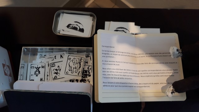 Nous allons vous distribuer des lettres. A vous de voir quelles correspondances vous pouvez établir avec ces lettres mais aussi quelles correspondances ces lettres vont vous permettre d’établir, entre vous, avec les lieux et les objets qui vous entourent. Nous espérons qu’elles vont vous donner l’occasion de faire de belles rencontres.