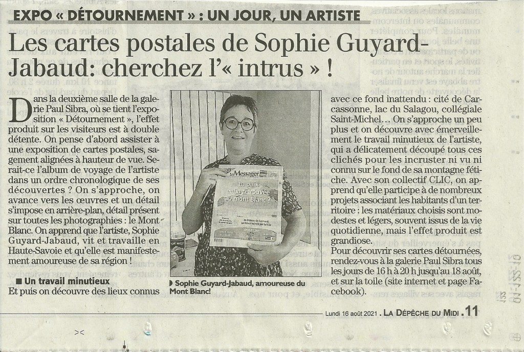Mon travail de recherche personnel s’articule autour du Mont-Blanc qui figure dans toutes mes productions. Je travaille sous forme de collections et de séries avec des médiums et des formats variables. Pour ce travail, j’ai collecté des cartes postales de tous les lieux dans lesquels je me rends et y ai intégré le Mont-Blanc. Ce Mont-Blanc qui est toujours présent en moi, qui m’accompagne dans tous mes déplacements, qui voyage grâce à moi.