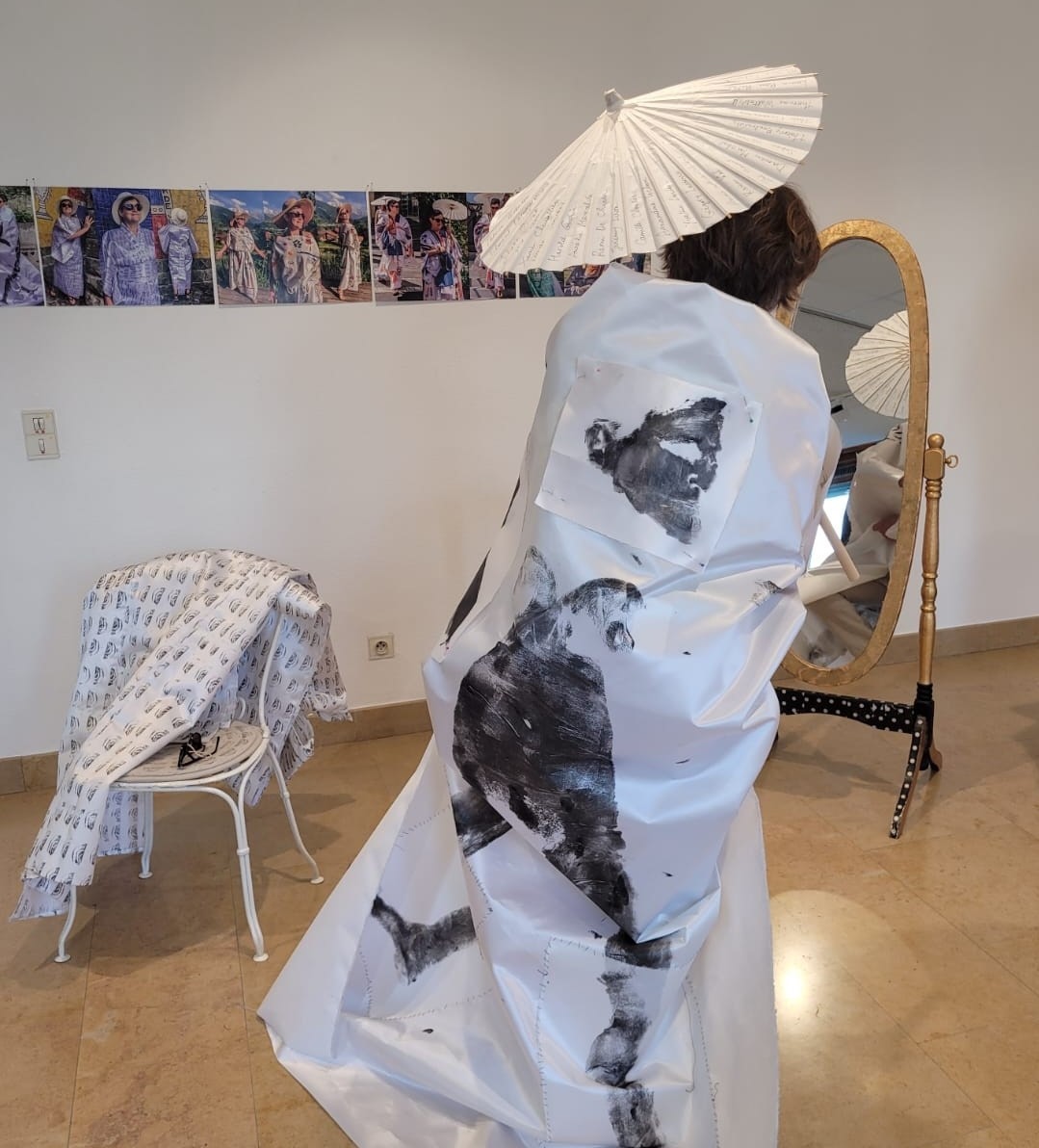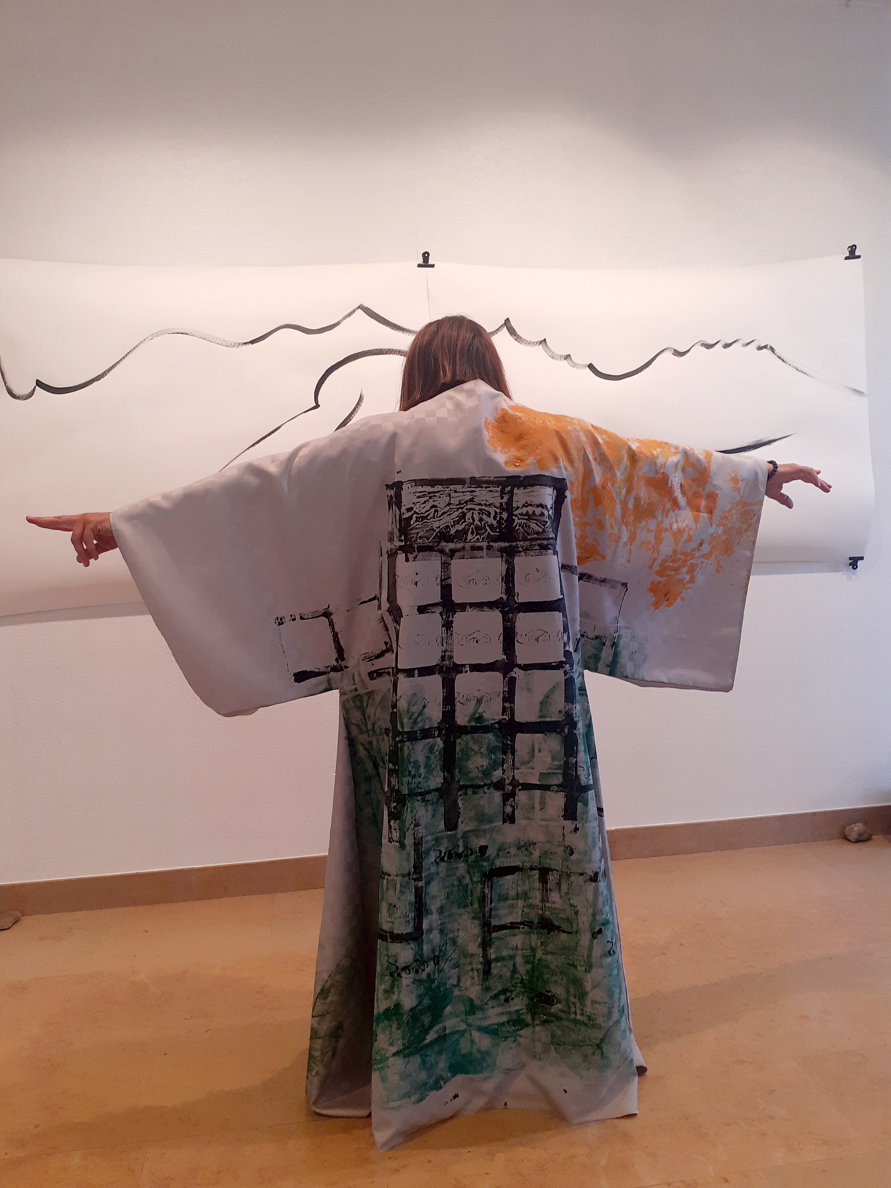 J’avais réalisé dans l’été une grande toile de 293 x 150 cm, résultat d’une performance lors de laquelle je tamponnais des « Mont-Blanc » sur toute la surface, montrant ainsi l’envahissement que cette majestueuse montagne exerce sur moi, mais aussi sur la population qui séjourne à ses pieds. Mon travail sur le Mont-Blanc m’avait amenée à faire de nombreuses recherches sur le Japon, Hokusaï et le Mont Fuji. La fonction symbolique du Kimono m’intéressait. Après avoir cherché comment le réaliser en utilisant uniquement des rectangles de tissu assemblés sans être redécoupés, je me suis lancée dans sa réalisation. Le Yukata est traditionnellement un vêtement d’été, signifiant littéralement « vêtement de douche ». Je choisis ce nom pour une toile réalisée en été. Il ne me restait plus qu’à habiter ce Yukata. Il fût à l’origine de nouvelles performances ayant pour objectif de montrer l’envahissement exercé par le Mont-Blanc et de rappeler à la population qu’il ne faut pas oublier l’environnement, la pollution de l’air et la fonte des glaciers étant deux catastrophes écologiques touchant le Pays du Mont Blanc.