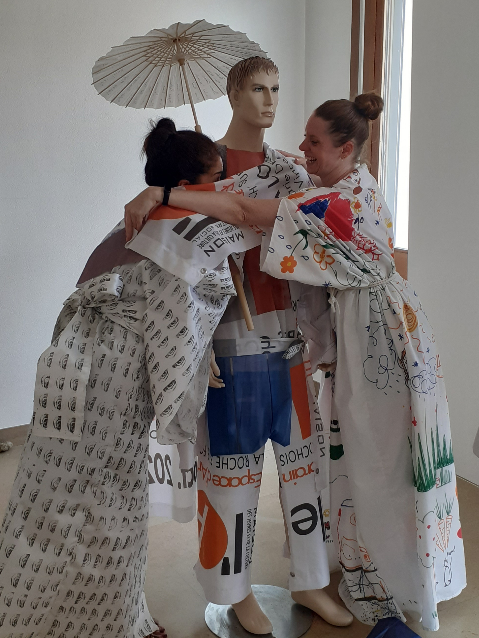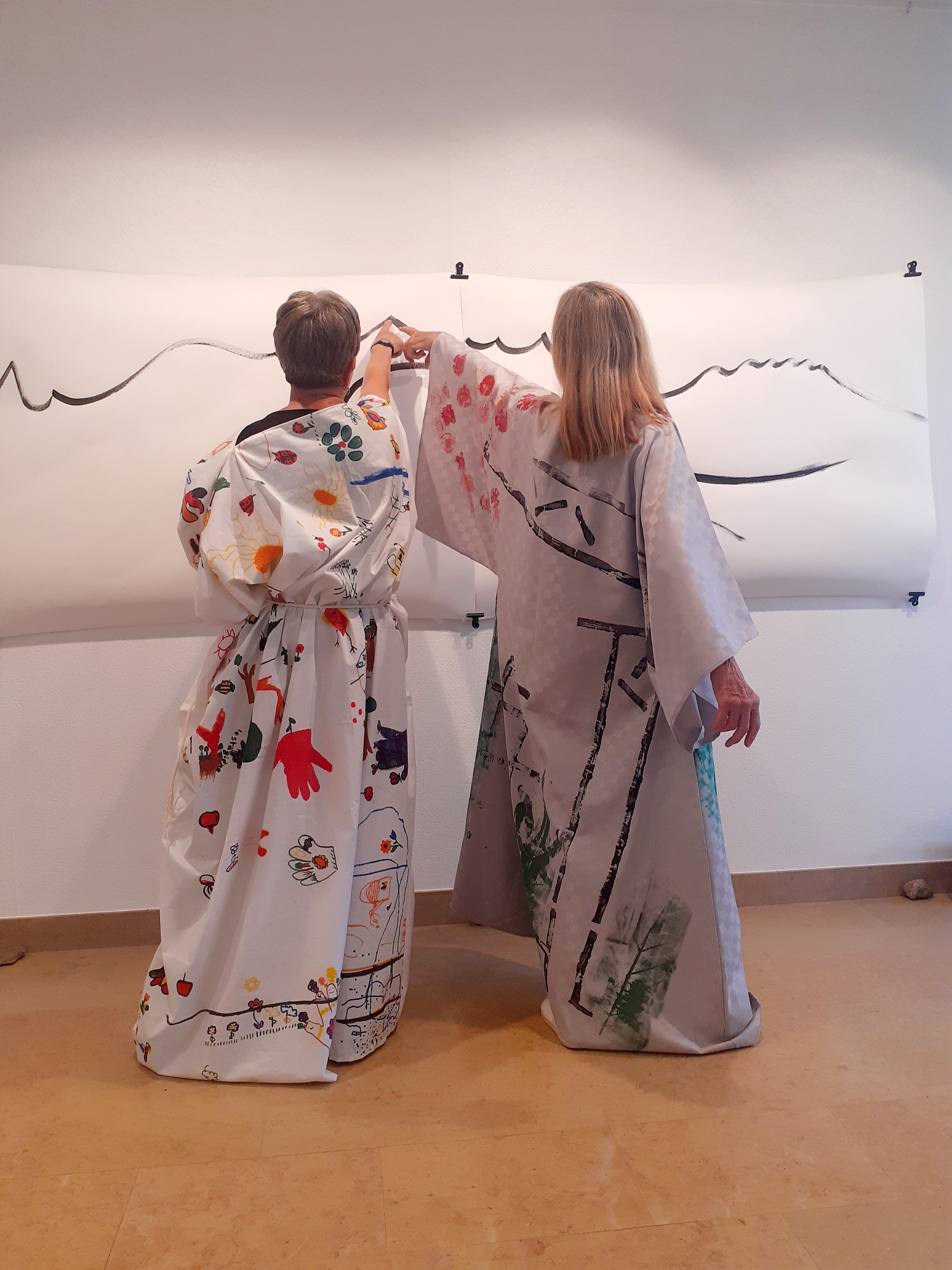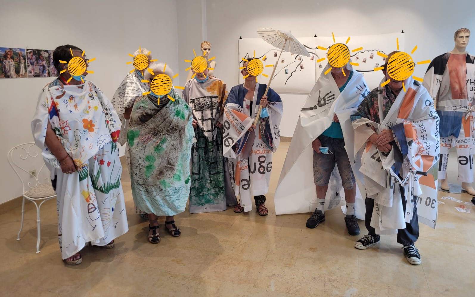 Lors de ma résidence à la MJC Centre Social Forum des Romains à Annecy, j’ai proposé aux personnes fréquentant le jardin partagé de la Solidarité, de dessiner sur un grand tissu placé comme une nappe sur la table : dessiner le jardin. Adultes et enfants ont pris un grand plaisir à se laisser aller avec des feutres pour créer cette œuvre collective. Lorsque la surface a été remplie, j’ai réalisé quelques coutures sans recouper le tissu afin de confectionner une toge romaine que j’ai portée lors d’une intervention pour la fête des jardins le 4 juin 2022.
