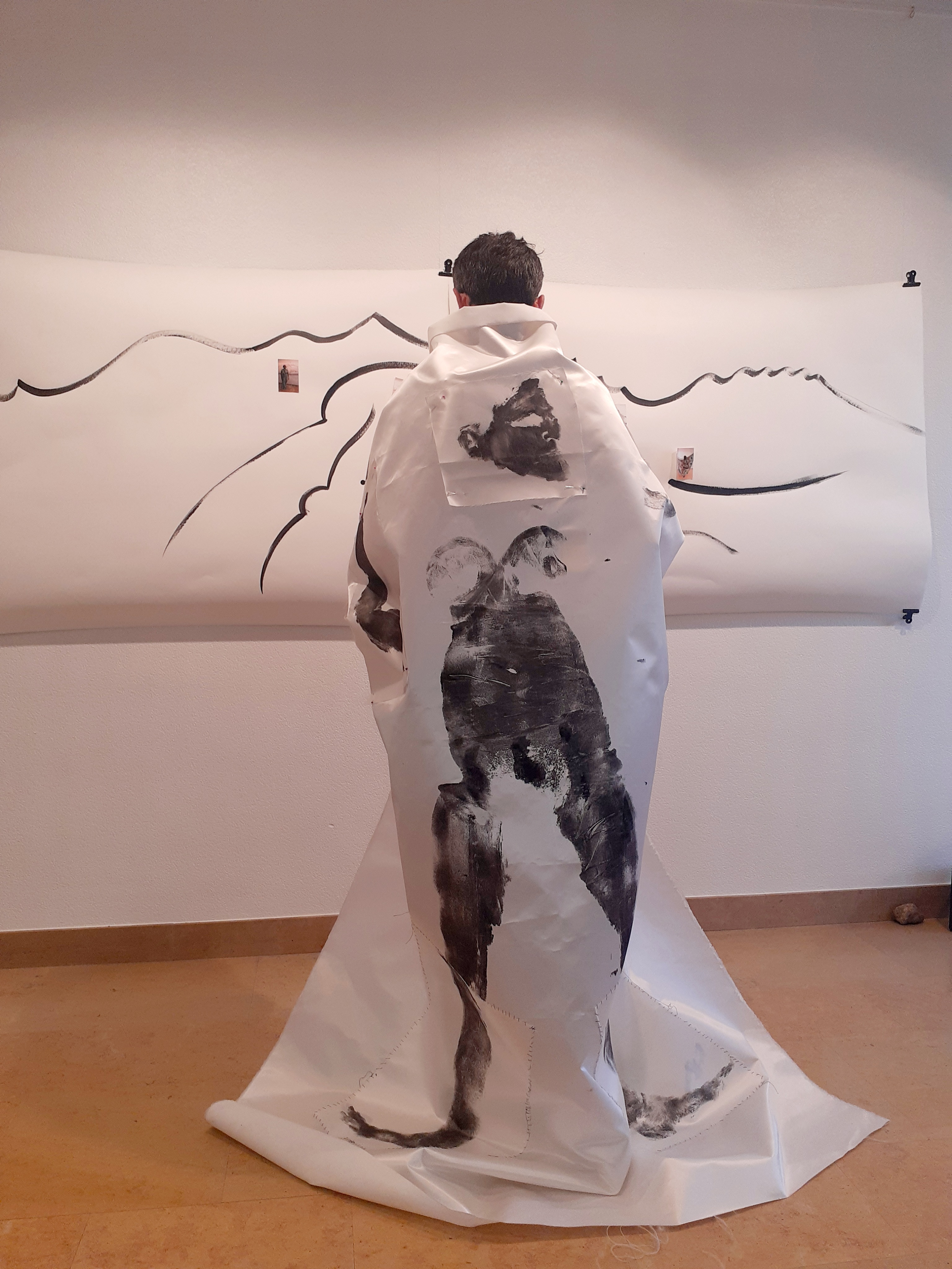 J’ai invité le public à se vêtir de mes « manteaux » et à se faire photographier dans l’espace d’exposition. Les photos, développées immédiatement à l’aide d’une petite imprimante Polaroïd, sont ensuite collées sur une fresque murale « Mont-Blanc ».