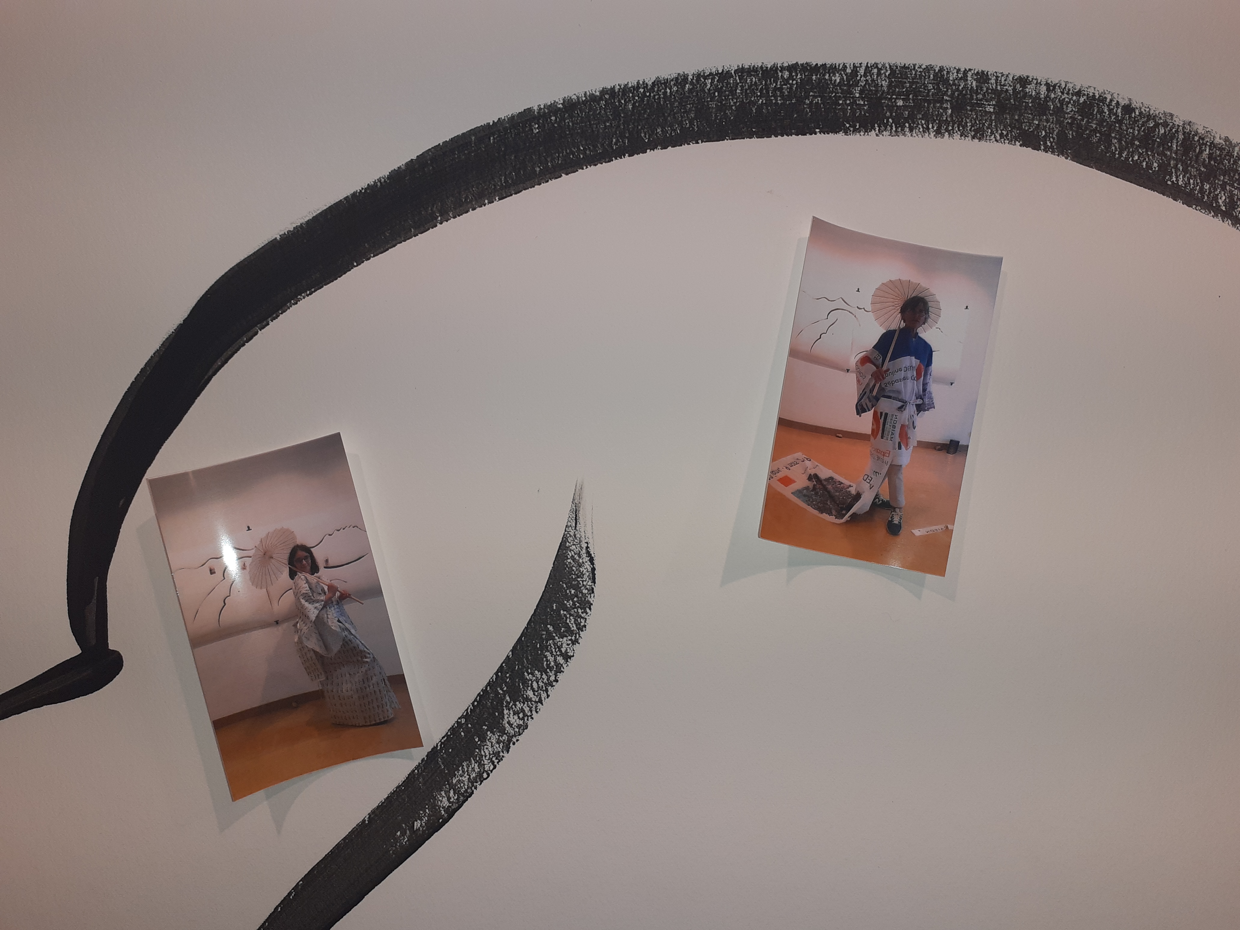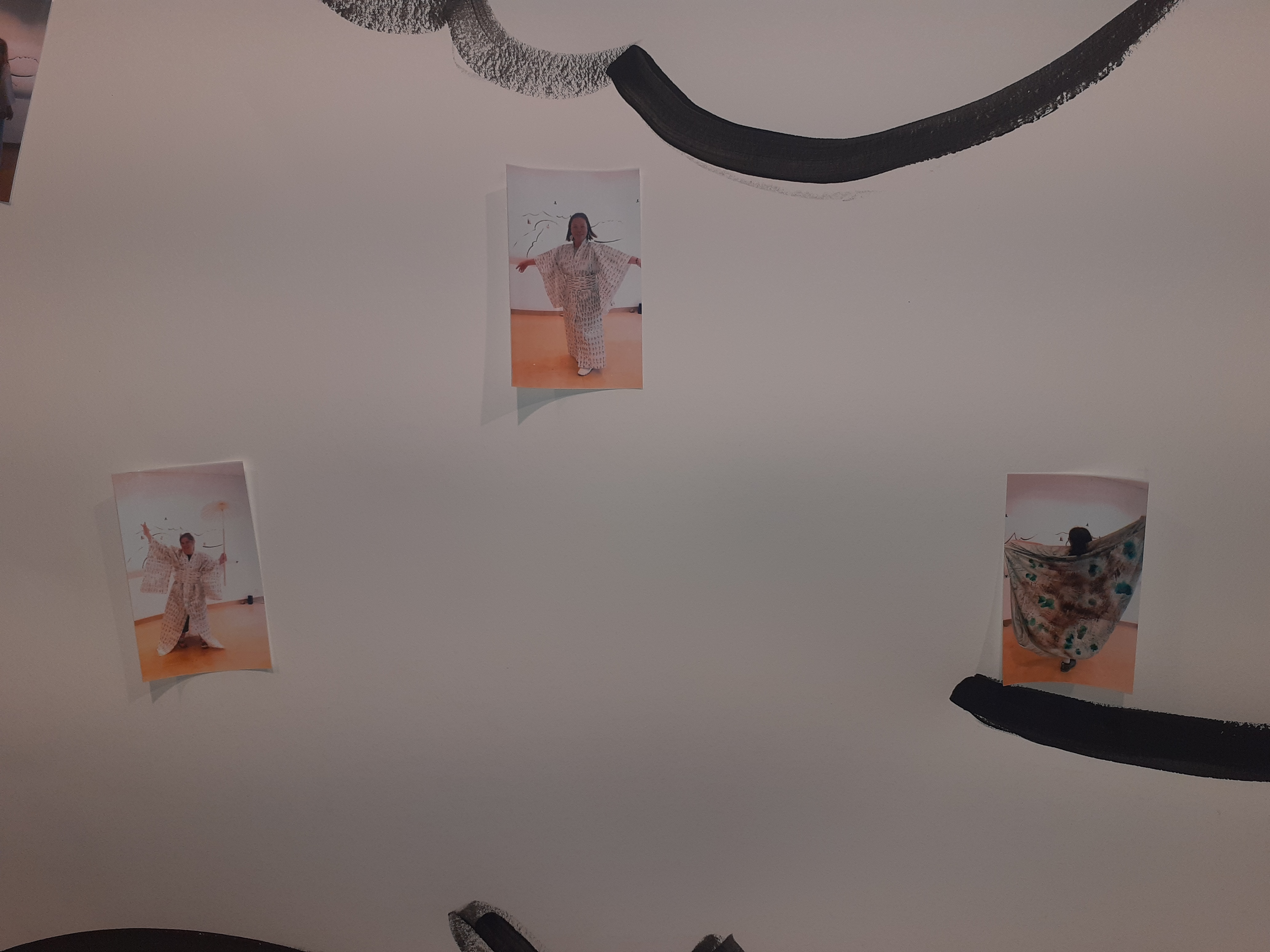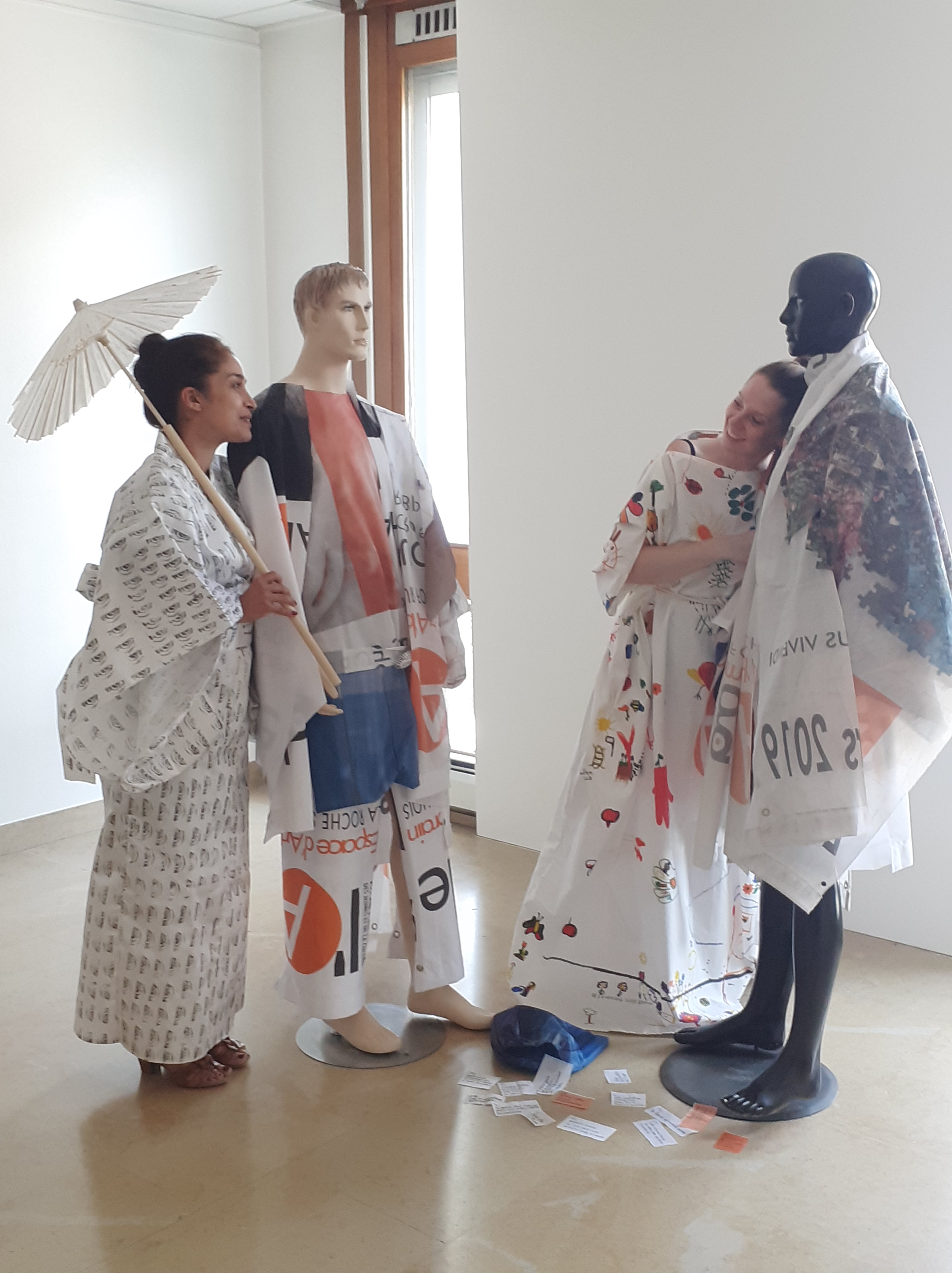 Six kimonos, mannequins, miroir, chaise, guéridon, accessoires de couture, fresque murale, photographies