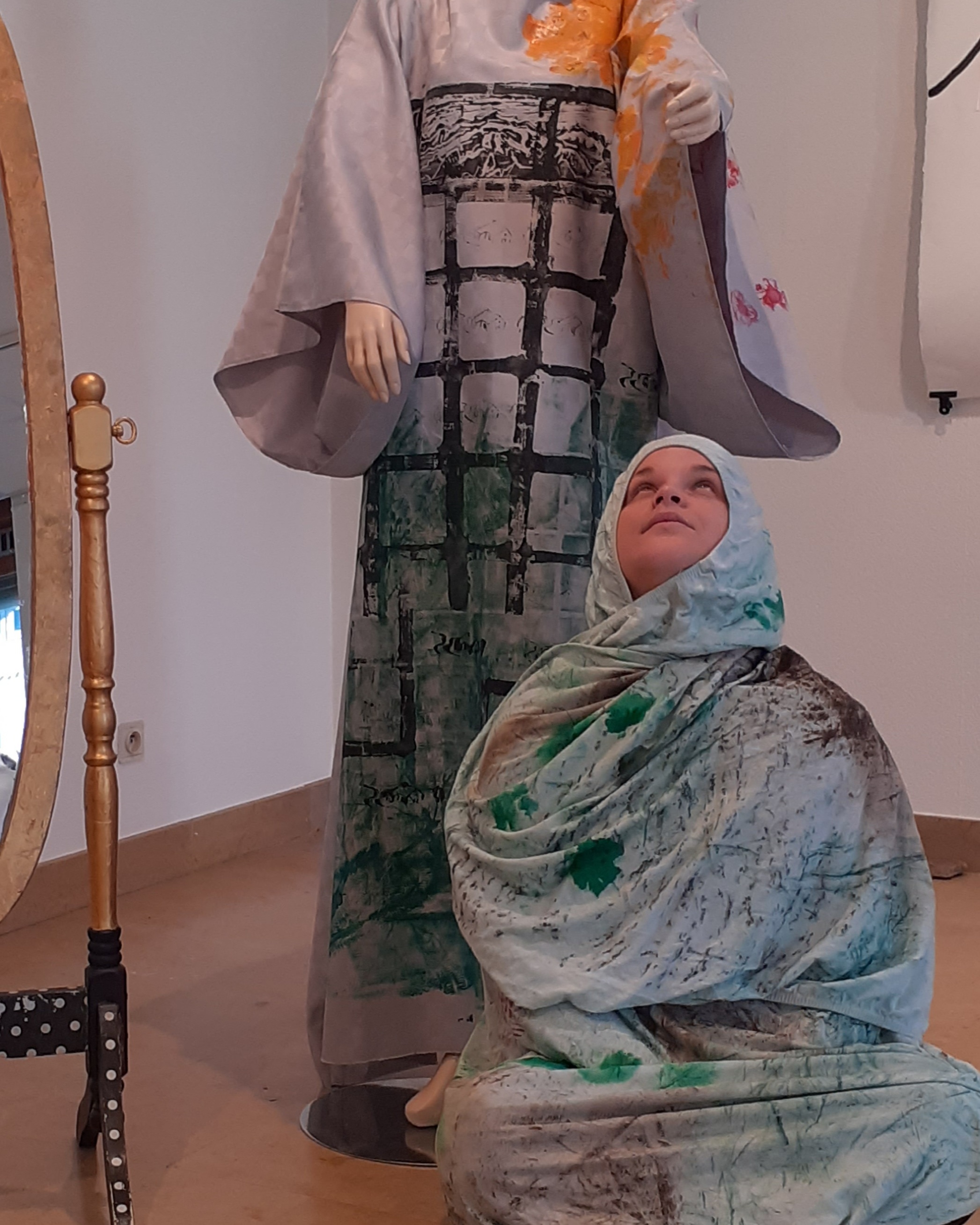 Les travaux d’empreintes de mon corps, ont été réalisés sur un grand tissu dans lequel je peux m’envelopper. J’y laisse des traces de moi. Il est comme un linceul qui garde l’empreinte de ce qu’il a enveloppé, il est aussi porteur de mémoires. Mémoire du moment de la réalisation de l’œuvre, mais aussi mémoire de chaque enveloppement ultérieur.