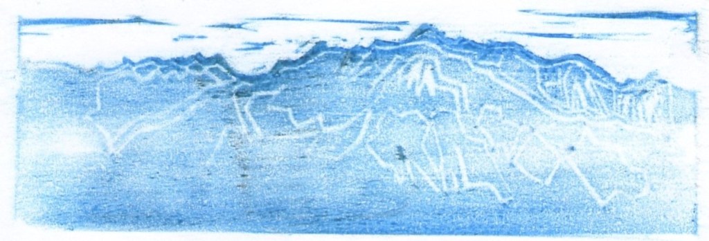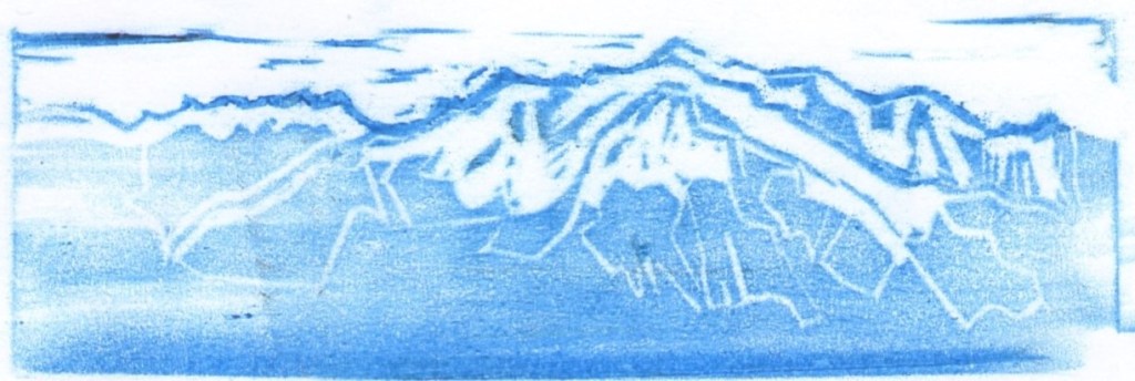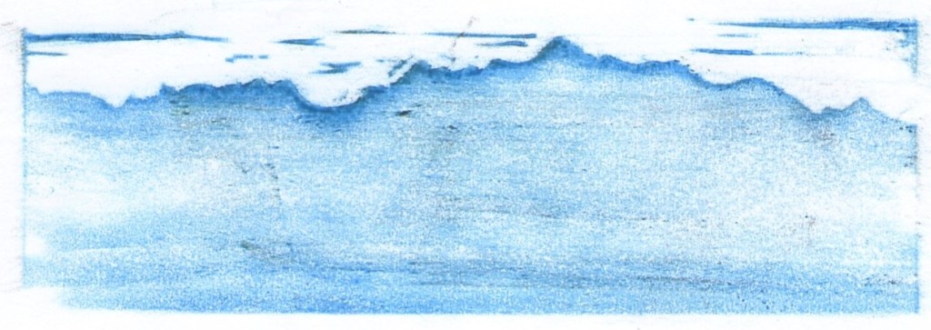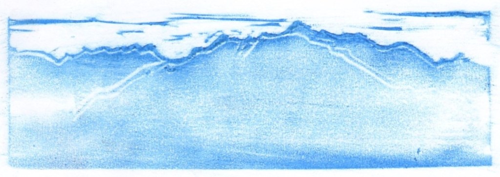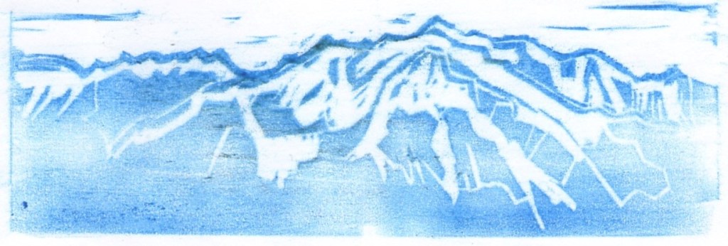 Série de cinq empreintes numérotées, pastel à la cire sur papier, 21 X 14,8 réalisée par frottage lors de la réalisation du Grand Tampon Mont-Blanc. Au fur et à mesure de l’avancement de la gravure de la plaque de linoléum, une simple feuille de papier a été appliquée sur celle-ci. La feuille a ensuite été frottée à l’aide d’une grosse craie à la cire, révélant ainsi l’image créée. A l’inverse de l’impression qui révèle une image opposée à celle de la matrice, le frottage permet d’obtenir une image identique à celle créée sur la plaque gravée. C’est ici la raison de son utilisation. Ce procédé a été renouvelé jusqu’à l’obtention d’un résultat satisfaisant. La série d’empreintes monochromes obtenue révèle l’approche progressive de la réalisation finale. L’avancée du travail correspond à l’avancée réelle d’un cheminement vers le Mont-Blanc. La première image suggère la silhouette d’un massif montagneux. Sa ligne de crête se découpe nettement sur le fond blanc, le reste du massif se trouve comme dans le brouillard. Il ne s’agit pas ici de pollution mais de suspension dans l’atmosphère de très petites gouttelettes d’eau, sous l’effet de mouvements turbulents de l’air. Sur cette première empreinte, le brouillard est un nuage dont la base touche le sol. La couleur bleue transmet une ambiance froide. Le duo bleu/blanc évoque une atmosphère hivernale. L’hiver, par beau temps, la montagne blanche, couverte de neige, se détache sur le bleu éclatant du ciel. Ici, c’est l’inverse. L’estampe ne se crée-t-elle pas à l’inverse du résultat attendu ? La seconde image ne nous dévoile que peu de lignes, l’une, située sur les hauteurs, double la ligne de crête et suggère un cheminement en traversée, avec peu de dénivelé, permettant d’appréhender un paysage à perte de vue. L’autre, part de plus bas, nous emmène vers le sommet puis redescend un peu plus loin après un cheminement plus difficile, plus escarpé, évoquant l’ascension du mont Fuji par les pèlerins. Quelle ligne choisir ? Celle qui reste infiniment sur les hauteurs ou celle qui nous fait voyager d’un monde à l’autre, du monde matériel au monde spirituel ? Les images suivantes se peuplent de lignes à un rythme beaucoup plus soutenu. La montagne est rapidement envahie, de plus en plus d’espaces se creusent, révélant l’image touristique et mercantile excessivement exploitée du « toit de l’Europe ». J’envisage de faire encore évoluer la gravure de ce tampon, poursuivant l’invasion des lignes, signes de l’invasion économique, jusqu’au vide total de la forme. La seule trace laissée sur le papier serait la ligne de crête. La dernière image serait proche de la première. La forme pleine de la première deviendrait la forme vide de la dernière, le brouillard bleu laisserait sa place à un nuage de pollution blanc.